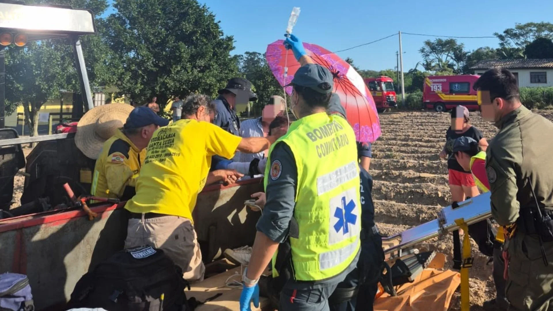 No local, a vítima estava em pé, consciente e orientada, com sinais vitais normais. O braço direito, incluindo mão e antebraço, ficou preso à máquina, apresentando fratura exposta e grande laceração. Para controlar a hemorragia, a equipe aplicou torniquete imediatamente.