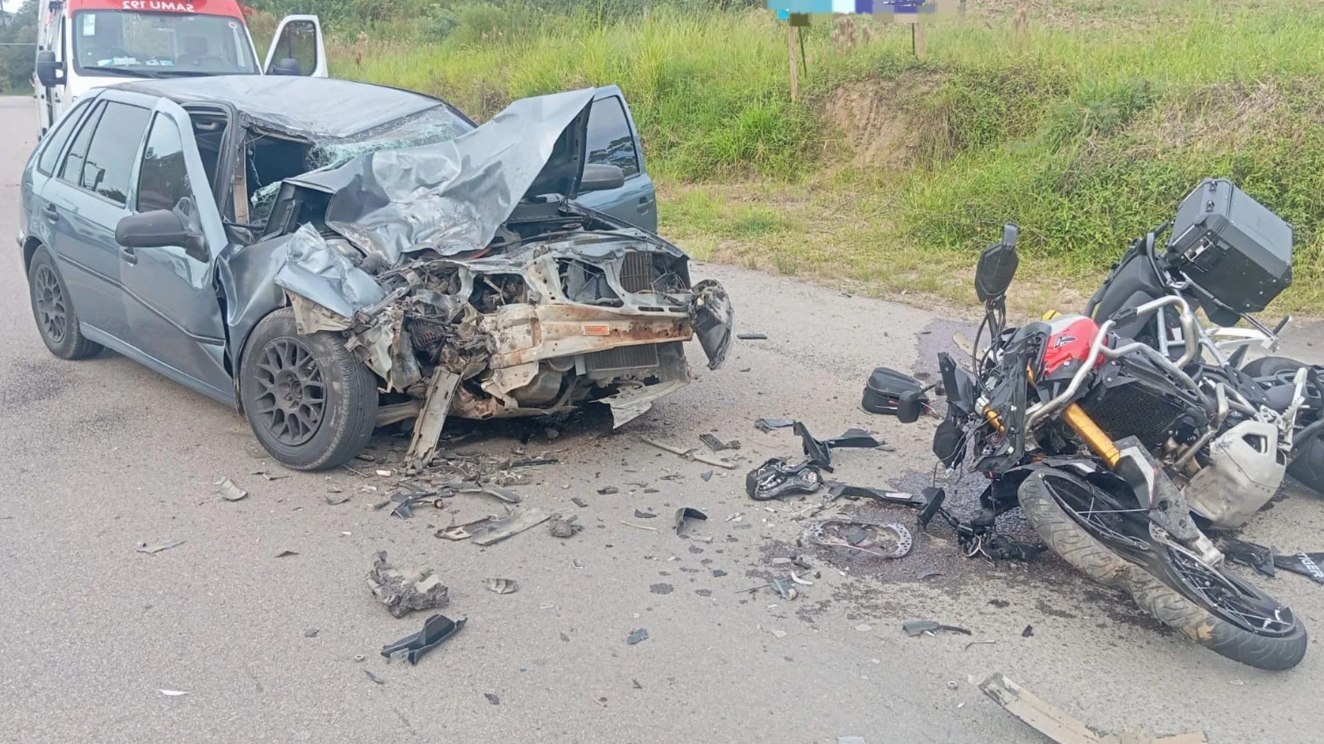 Uma mulher morreu e dois homens ficaram feridos em um grave acidente de trânsito na tarde desta terça-feira (14), na rodovia SC-446, em Lauro Müller. A colisão, que envolveu um carro e uma motocicleta, ocorreu por volta das 15h13.