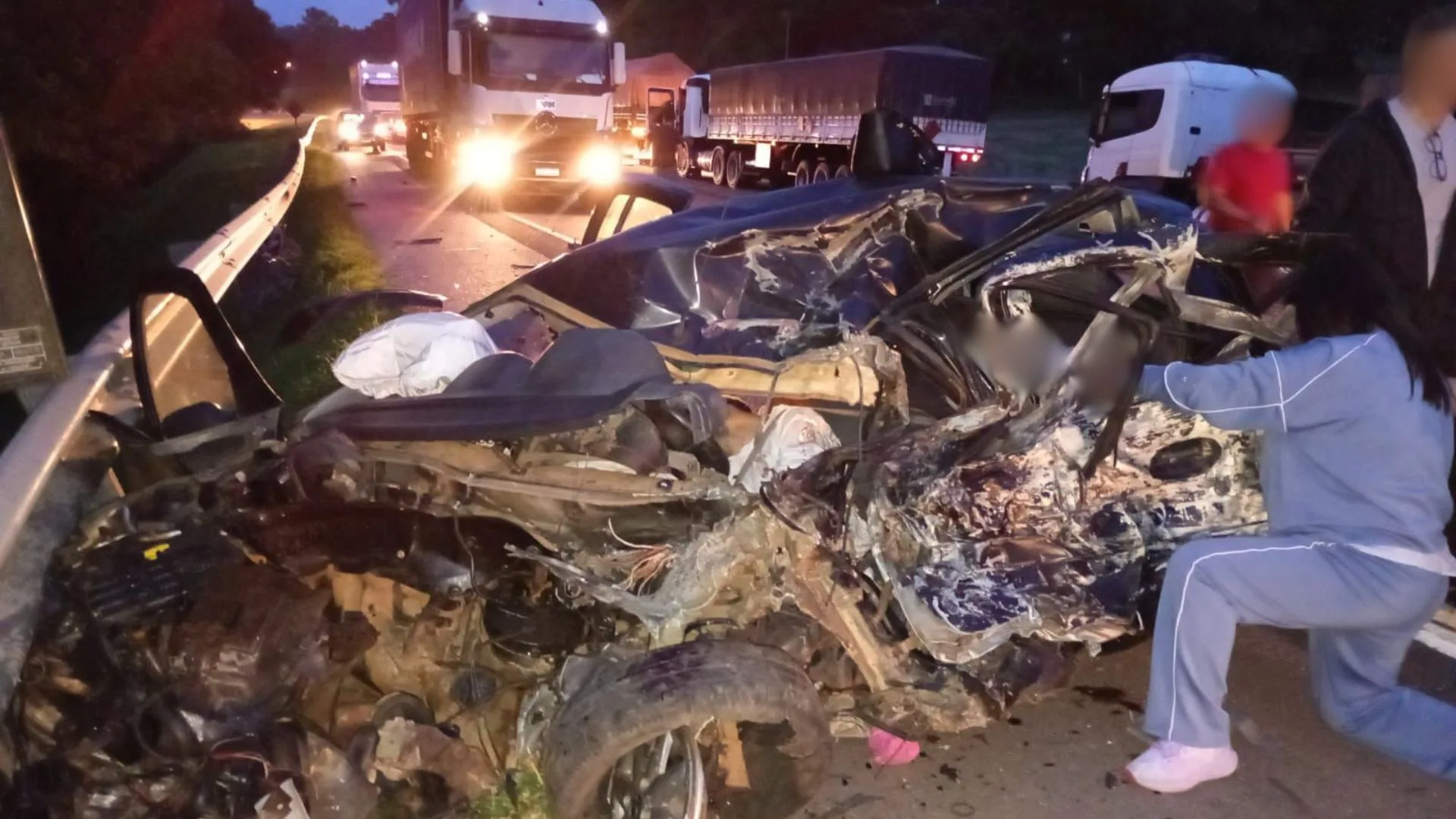 As vítimas estavam em um Renault Clio, com placas de Curitibanos, na Serra catarinense. Morreram no local o motorista, de 40 anos, a passageira, de 24 anos, e o filho do casal, de 4 anos. Todos morreram ainda no local do acidente.