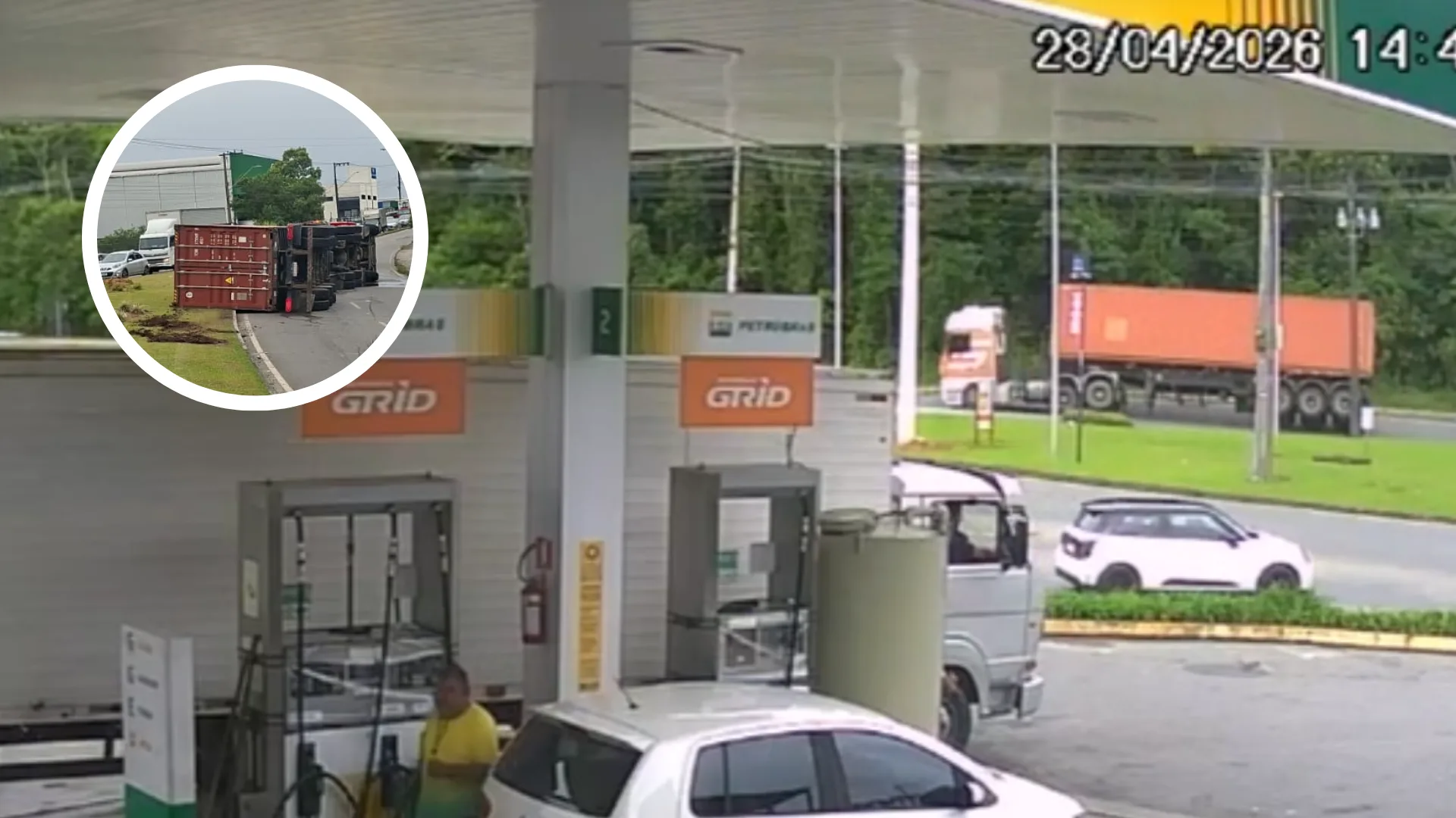 Imagens de câmeras de segurança registraram o momento em que a carga do caminhão se desloca o lado e provoca o desequilíbrio do veículo.