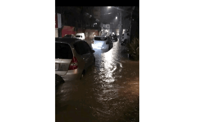 Nas redes sociais, imagens mostram pontos de alagamento nos bairros Campinas e Kobrasol. A água chegou a cobrir as rodas de veículos na rua Caetano José Ferreira, conforme vídeo publicado por moradores.