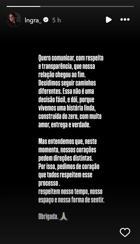 No comunicado, Ingra afirmou que a decisão foi tomada em conjunto e não foi fácil. “Essa não é uma decisão fácil, e dói, porque vivemos uma história linda, construída do zero, com muito amor, entrega e verdade”, escreveu.