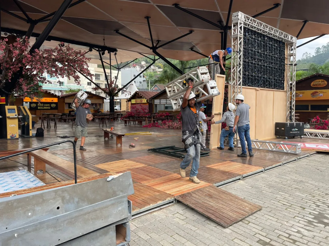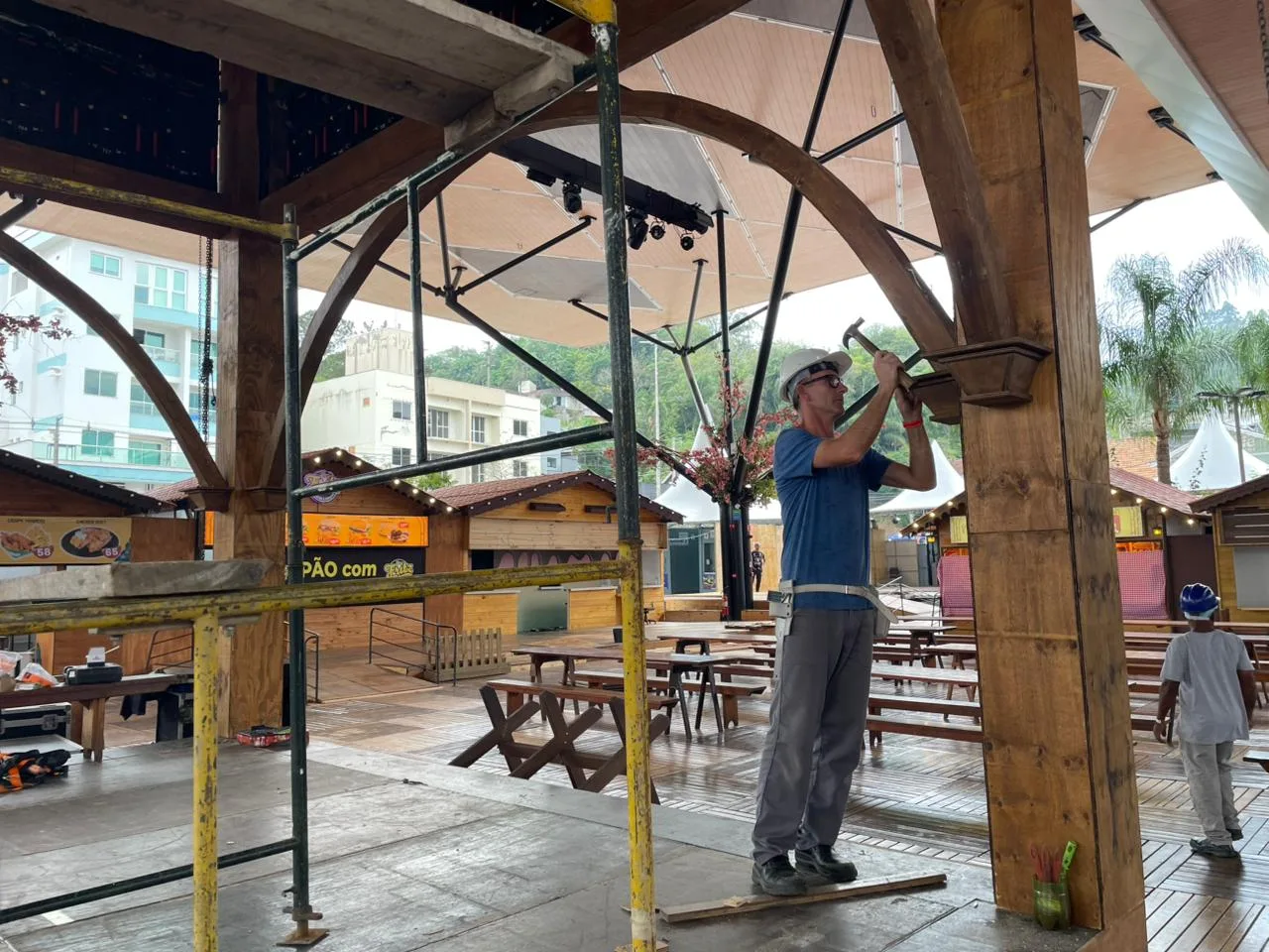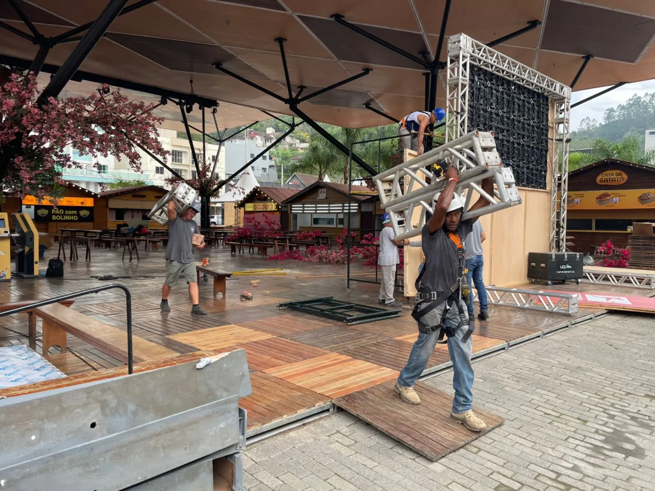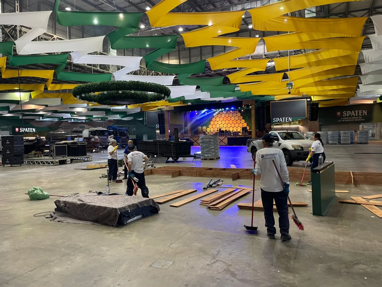 Ao todo, cerca de 600 profissionais estão envolvidos na montagem da estrutura, que abrange os pavilhões da Vila Germânica e o ginásio Galegão. O trabalho inclui desde os detalhes de ambientação temática até a instalação de sistemas elétricos, iluminação e sonorização, além da preparação das áreas gastronômicas e dos espaços de convivência.