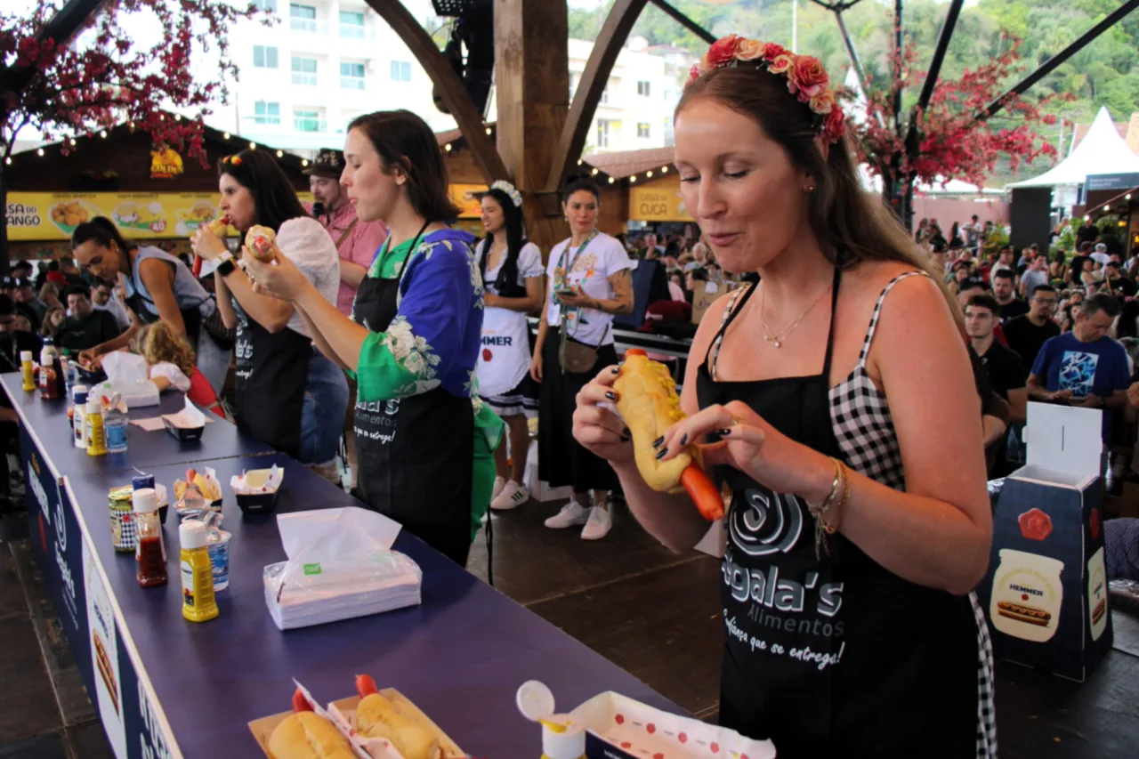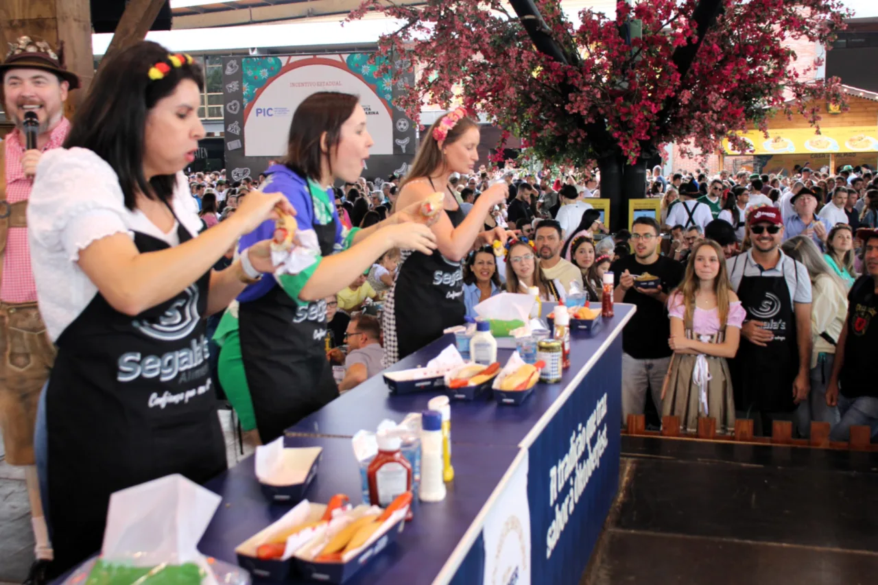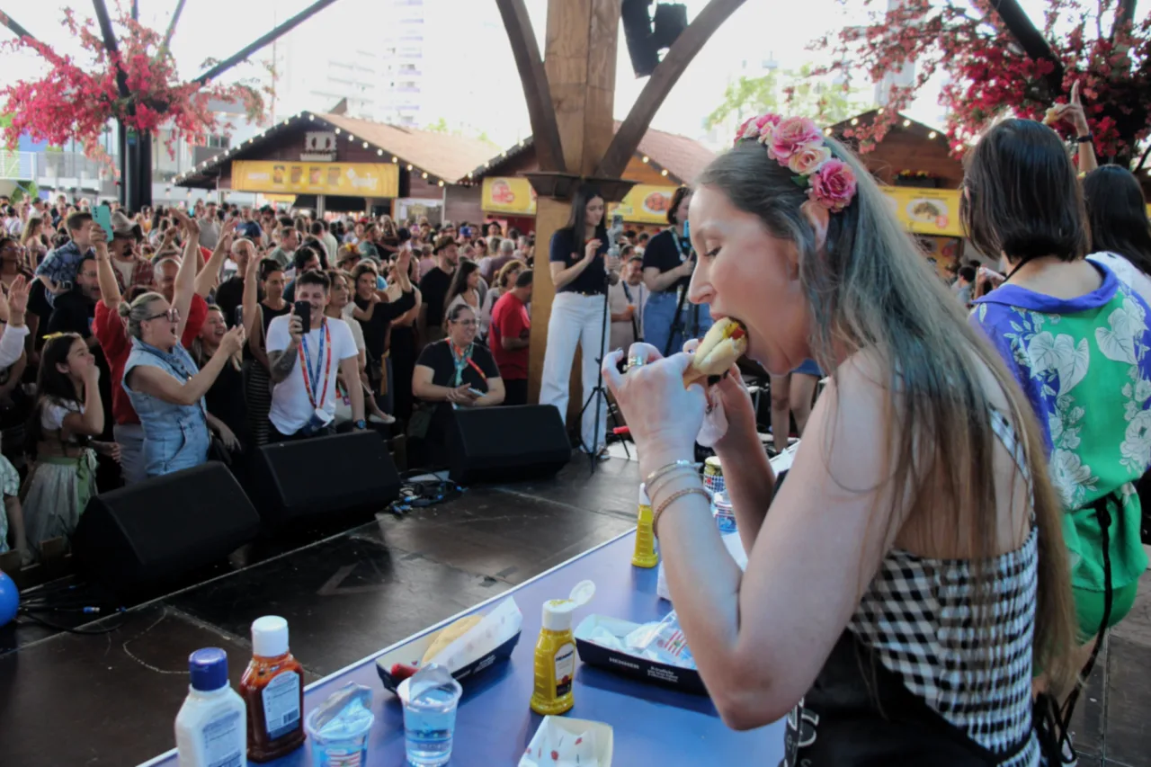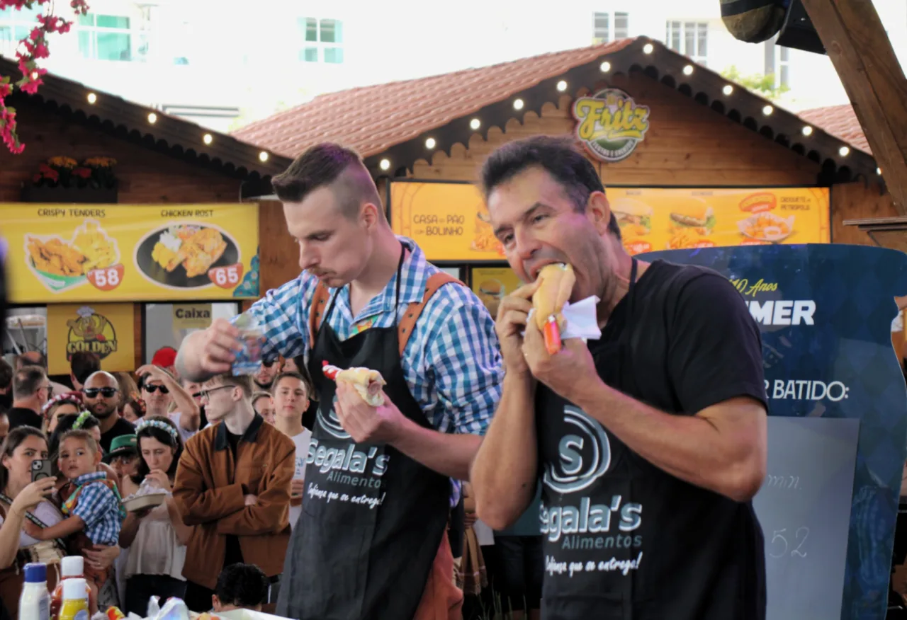 Entre risadas, torcida e muita animação, a tradicional Competição de Comedores de Bratwurst da Oktoberfest Blumenau voltou a agitar o Boulevard Spaten Garten, no Parque Vila Germânica, neste domingo (19). O desafio, realizado todos os domingos da festa ao meio-dia, testa quem consegue comer o clássico Bratwurst, típico sanduíche alemão com salsicha artesanal, no menor tempo possível.