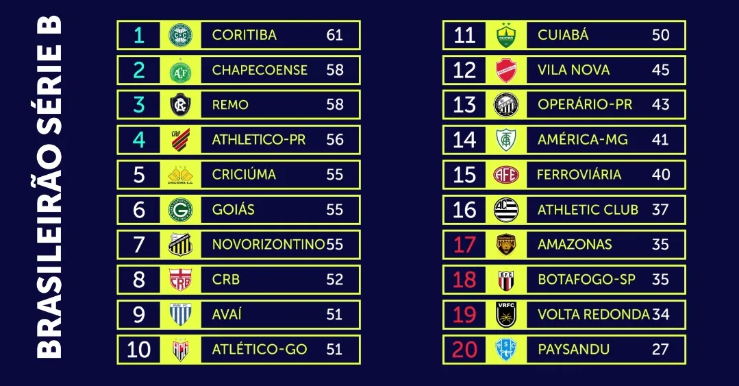 Confira a tabela de classificação atualizada da Série b: