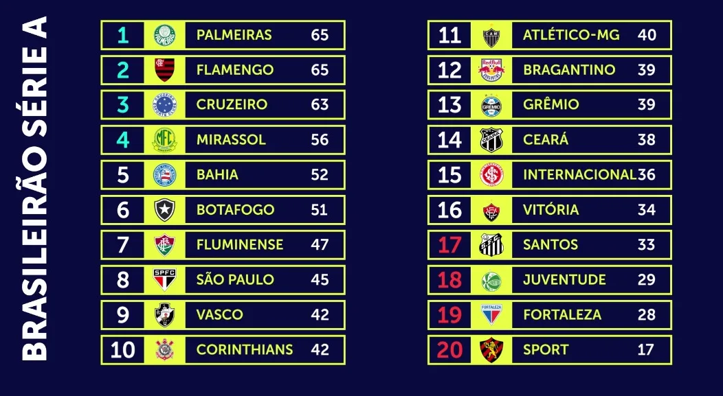 O Palmeiras entra em campo nesta quinta-feira diante do Santos, que, com os resultados da rodada, voltou à zona de rebaixamento. A 32ª rodada se encerra com Fluminense x Mirassol e o Clássico-Rei entre Ceará e Fortaleza.