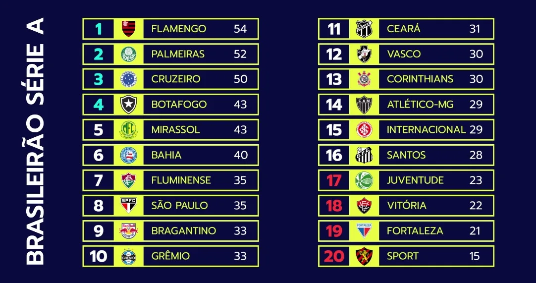 - Ainda jogam: Fortaleza x São Paulo, Flamengo x Cruzeiro e Vitória x Ceará.