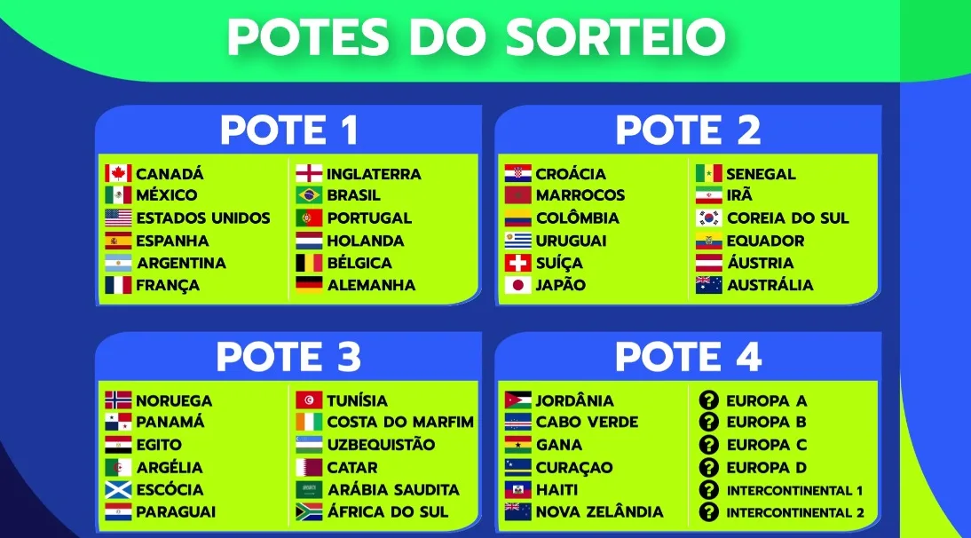O Pote 4 contará com Jordânia, Cabo Verde, Gana, Curaçao, Haiti, Nova Zelândia, os quatro vencedores da repescagem europeia e os dois classificados do playoff