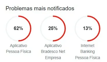 Nos gráficos, também exibidos no site, as falhas são registradas 62% no Aplicativo Pessoa Física, 25% no Aplicativo Bradesco Net Empresa e 13% na Internet Banking Pessoa Física.