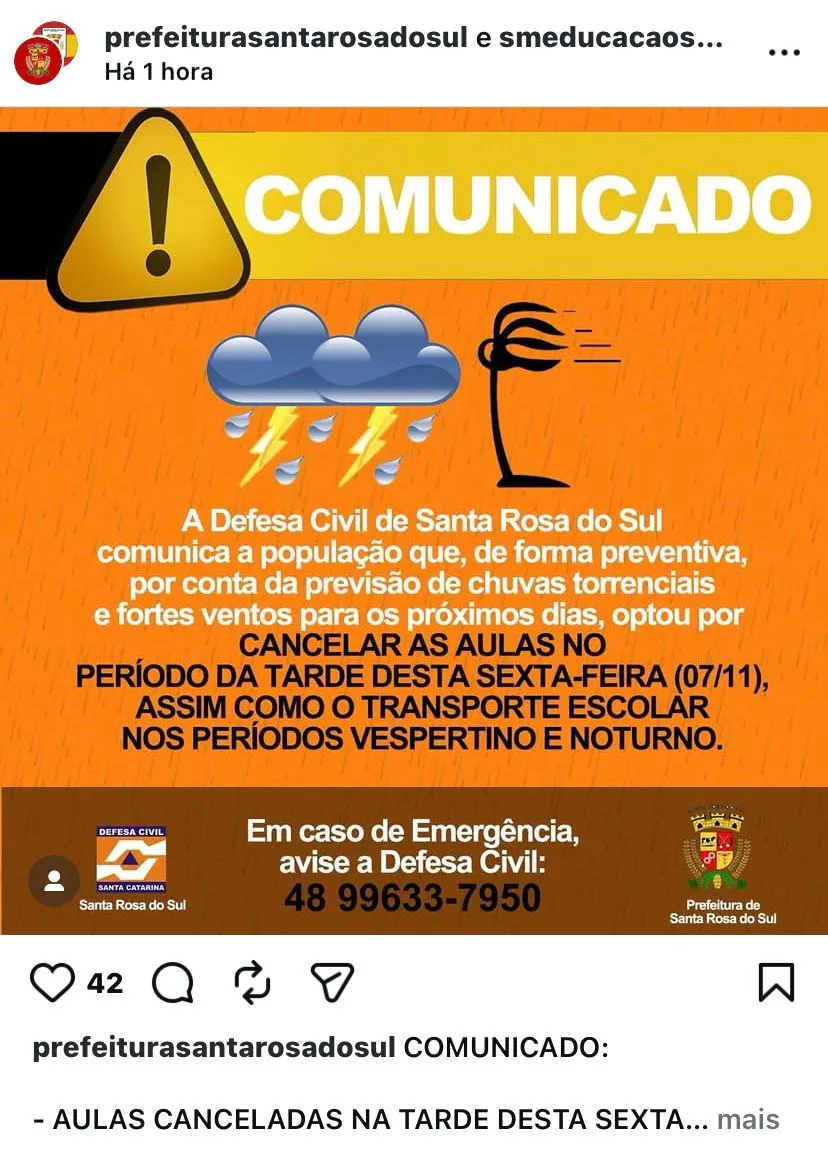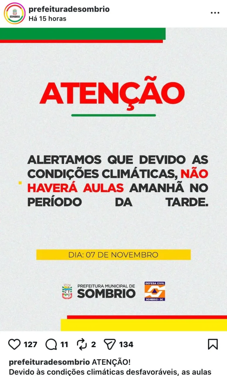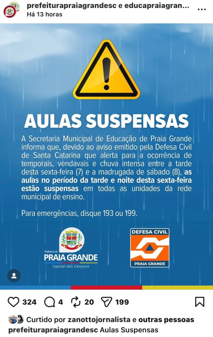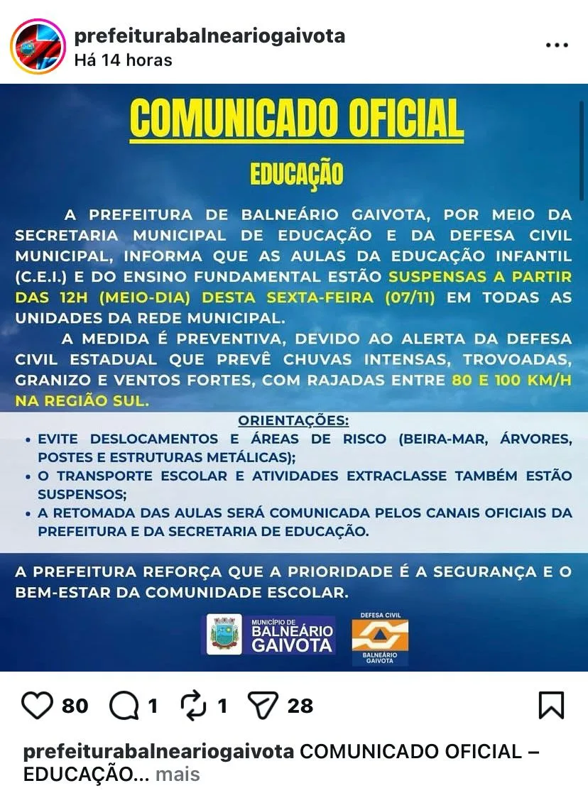 O mau tempo voltou a preocupar Santa Catarina. Por causa do alerta vermelho emitido pela Defesa Civil, ao menos quatro cidades do Sul do estado Praia Grande, Balneário Gaivota, Sombrio e Santa Rosa do Sul decidiram suspender as aulas das redes municipais nesta sexta-feira (7). A medida é preventiva diante da previsão de chuvas fortes, ventos intensos e risco de temporais isolados.
