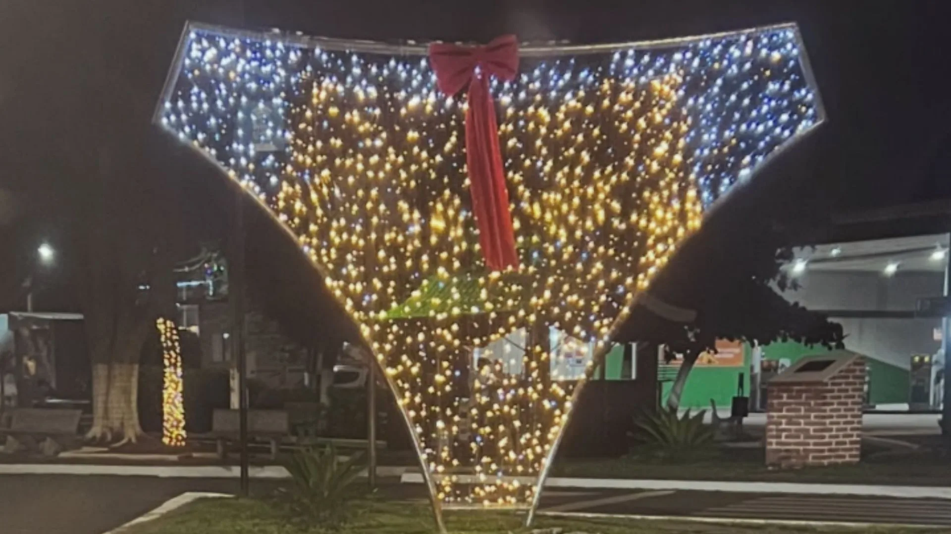 Uma calcinha gigante iluminada tem chamado a atenção na decoração de Natal de Monte Belo, no Sul de Minas Gerais. O enfeite, instalado para destacar a importância da indústria da moda íntima, principal atividade econômica do município, tem gerado comentários nas redes sociais pela forma inusitada.