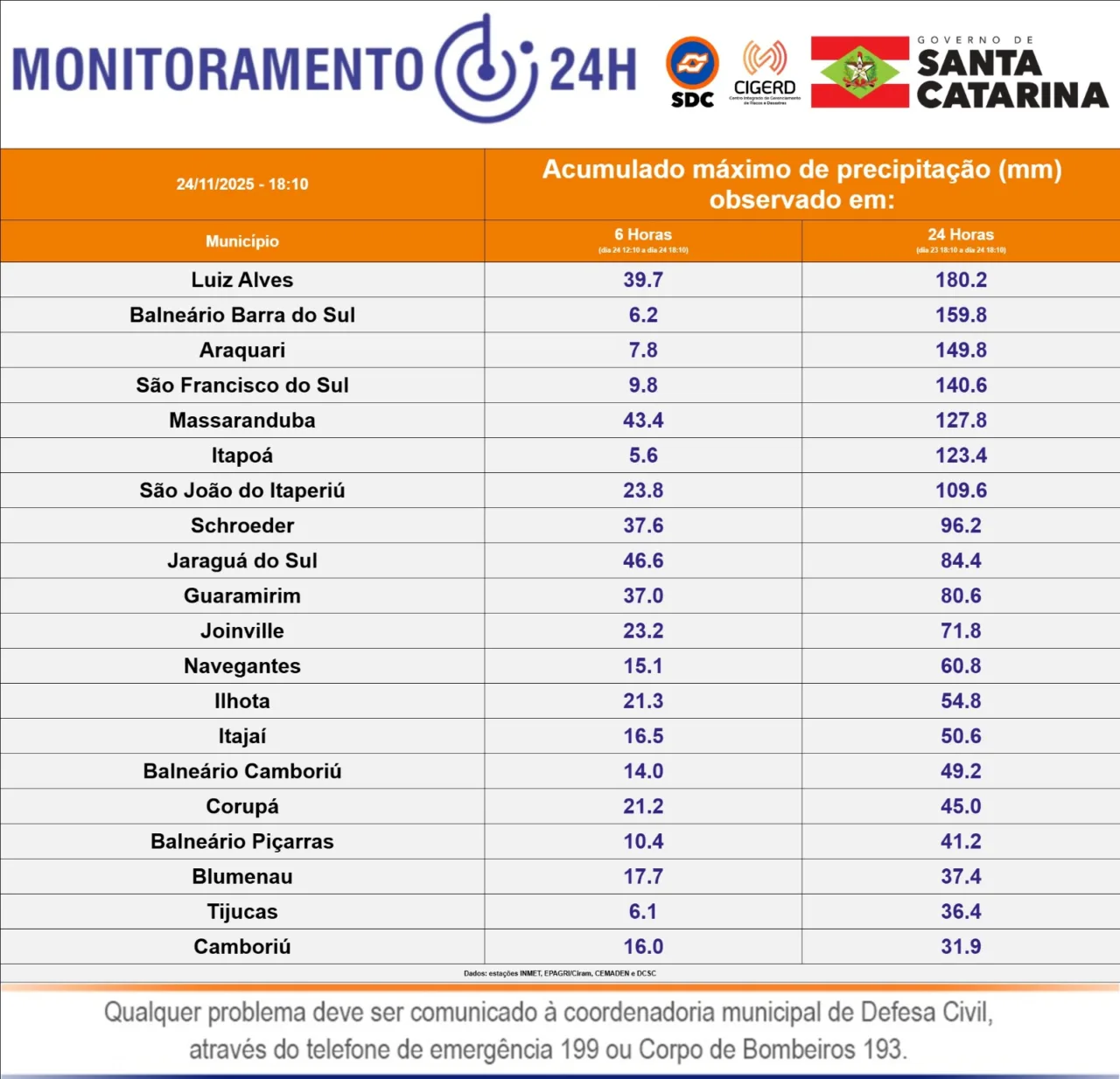 Santa Catarina enfrentou mais um dia de chuva intensa nesta segunda-feira (24), com acumulados extremos registrados em várias cidades do Norte e Vale do Itajaí. Dados oficiais da Secretaria de Estado da Proteção e Defesa Civil (SDC) mostram que Luiz Alves foi o município mais atingido, acumulando 180,2 mm em apenas 24 horas, volume considerado alto, segundo a Defesa Civil