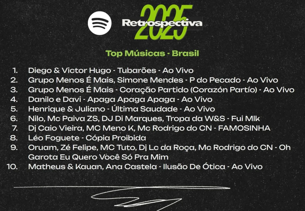 Entre os destaques estão Henrique & Juliano, Grupo Menos É Mais e Diego & Victor Hugo, que dominaram as playlists brasileiras.
