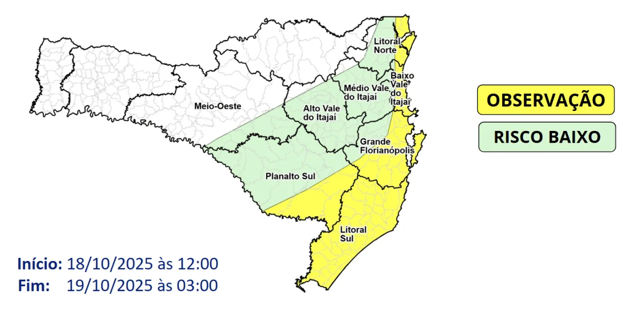 A formação e o avanço de uma frente fria entre esta quinta-feira (16) e a madrugada do sábado (18) devem provocar temporais isolados, chuva intensa e ventos de até 80 km/h em Santa Catarina. De acordo com a Defesa Civil, o risco é baixo a moderado para ocorrências relacionadas a alagamentos, danos na rede elétrica, destelhamentos e queda de galhos de árvores.