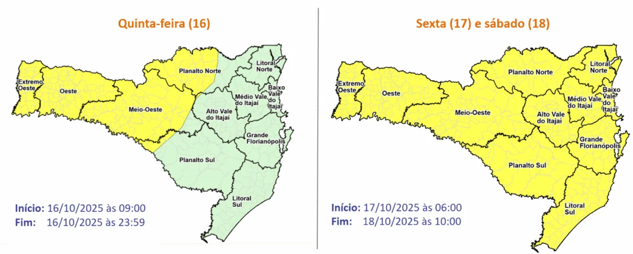 A instabilidade avança pelo Oeste e áreas de divisa com o Rio Grande do Sul, e se espalha para as demais regiões no decorrer desta quinta (16). Os temporais de maior intensidade são esperados no Grande Oeste e parte do Planalto Norte entre a tarde e a noite. Estes, podem vir acompanhados de raios, rajadas de vento e eventual queda de granizo.