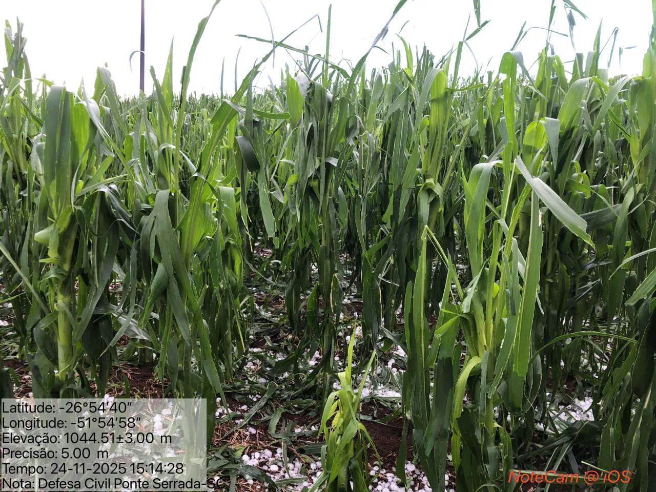 Até o momento, o único prejuízo confirmado ocorreu em Ponte Serrada, onde áreas de lavouras de milho foram danificadas pelo impacto do granizo, principalmente em regiões do interior do município.