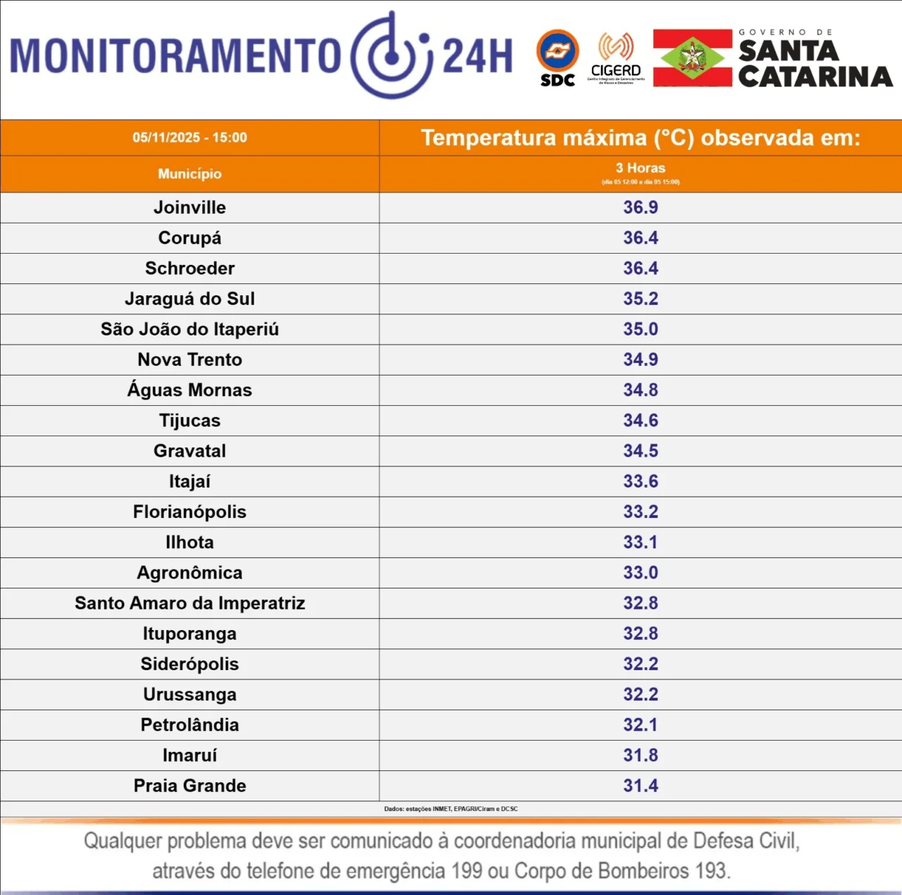 No Norte catarinense, outras cidades registraram calor intenso. Corupá e Schroeder marcaram 36,4°C, enquanto Jaraguá do Sul chegou a 35,2°C.