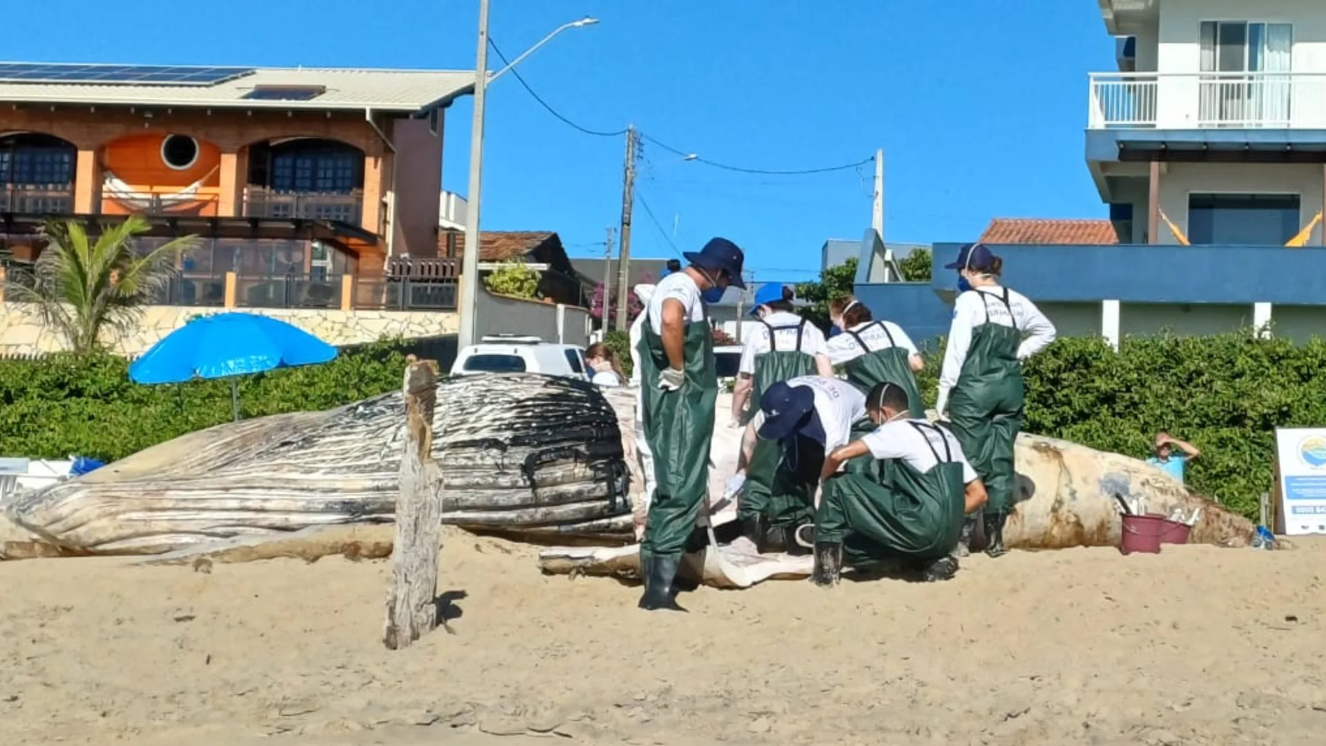 Uma baleia-jubarte de aproximadamente 7 toneladas foi encontrada morta na praia de Itajuba, em Barra Velha, no Litoral Norte de Santa Catarina, na tarde desta quarta-feira (4).