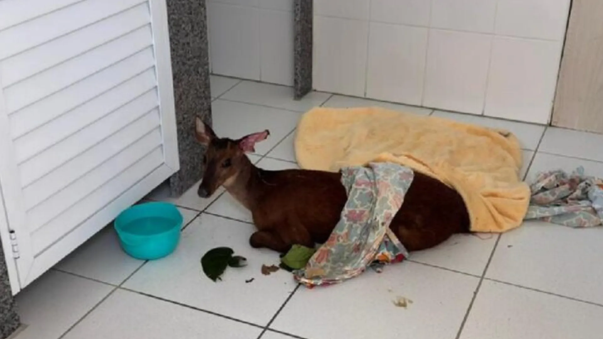 Debilitado, o cervo saltou para dentro de um açude. Ele foi retirado por algumas pessoas, que o abrigaram dentro do banheiro de uma empresa até chegada da Fujama.