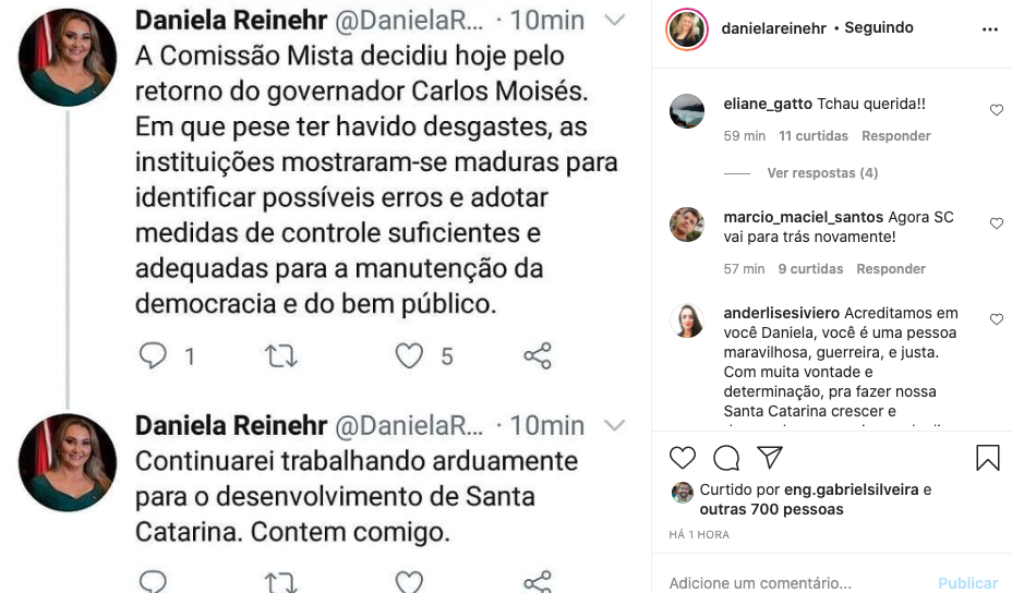 Nesta sexta-feira (27), depois da decisão no Plenário da Assembleia Legislativa que inocentou Carlos Moisés da Silva, a então governadora interina, Daniela Reinehr, publicou nas redes sociais que continuará trabalhando para o desenvolvimento de Santa Catarina.