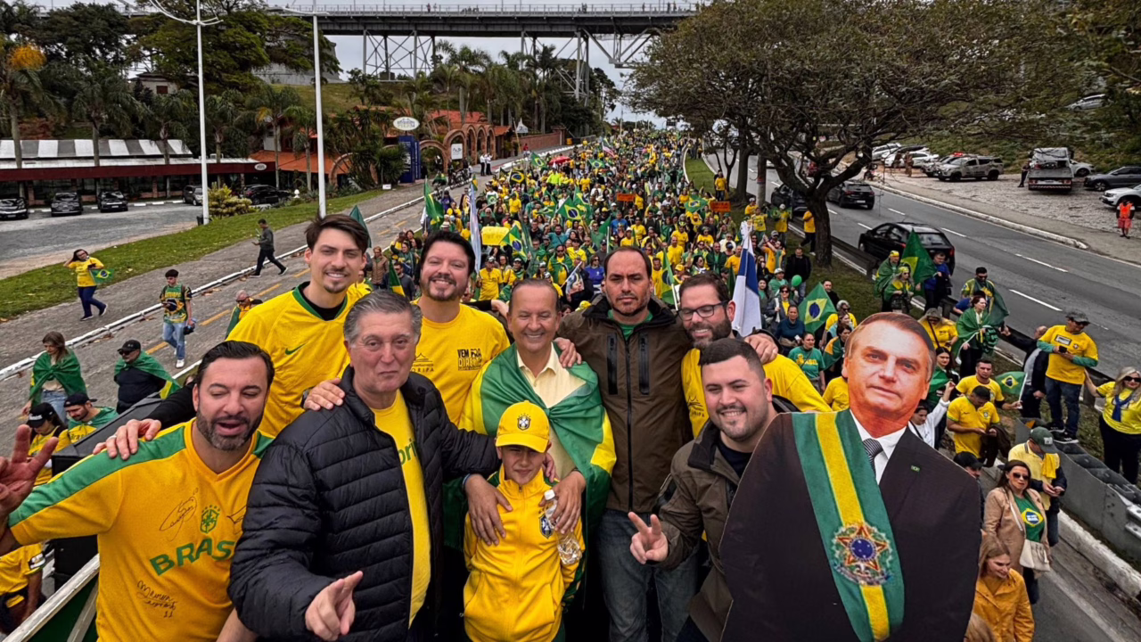 Na Beira-Mar Norte, em meio a vários trios elétricos, a manifestação da direita contou com a presença dos filhos do ex-presidente Bolsonaro, Carlos e Jair Renan, além dos senadores Jorge Seif (PL) e Esperidião Amin (Progressistas), deputados estaduais, federais e vereadores de partidos aliados.