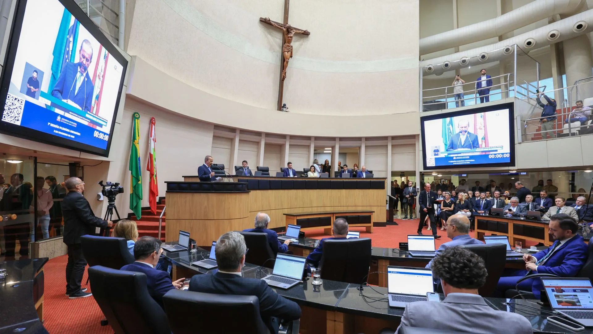 A sessão foi realizada no Plenário Deputado Osni Régis e liderada pelo 1º vice-presidente da Alesc, deputado Fernando Krelling (MDB). Também participaram a vice-governadora Marilisa Boehm (PL), deputados, secretários de Estado e integrantes do primeiro escalão do governo.