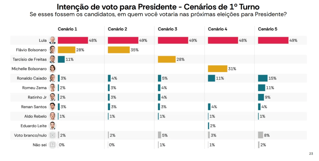 Um quadro em que Flávio (28%) e Tarcísio (11%) concorrem à Presidência da República também deixa Lula com percentual semelhante (48%).