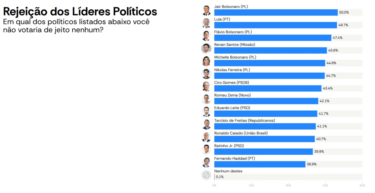 O levantamento ainda mediu rejeição dos principais políticos do país entre eleitores. Jair Bolsonaro lidera lista, com 50%. Depois, vêm Lula (49,7%), Flávio (47,4%), Renan Santos (45,6%) — do partido Missão, ligado ao Movimento Brasil Livre (MBL) — e Michelle (44,9%).