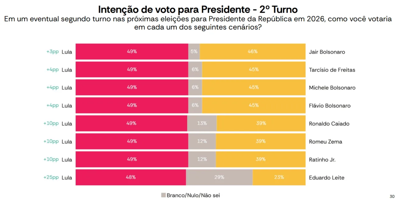 Cenários de segundo turno com outros candidatos aliados do ex-presidente Jair Bolsonaro (PL), preso após condenação por tentativa de golpe de Estado e inelegível, mostram índices parecidos.