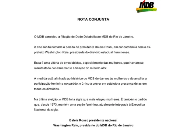 O comunicado oficial do MDB afirma que cancelou a filiação do ator a pedido do presidente da sigla, Baleia Rossi em concordância com o ex-prefeito Washington Reis, presidente do diretório estadual fluminense.