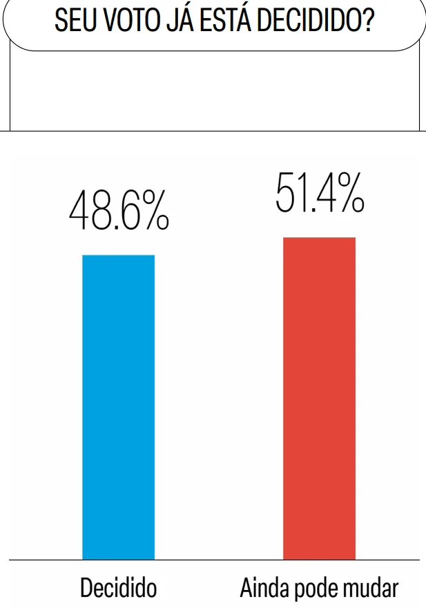 O Meio/Ideia ainda perguntou a eleitores se já decidiram em quem votar para presidente: 51,4% admitem que podem mudar de ideia e 48,6% afirmam que estão decididos.