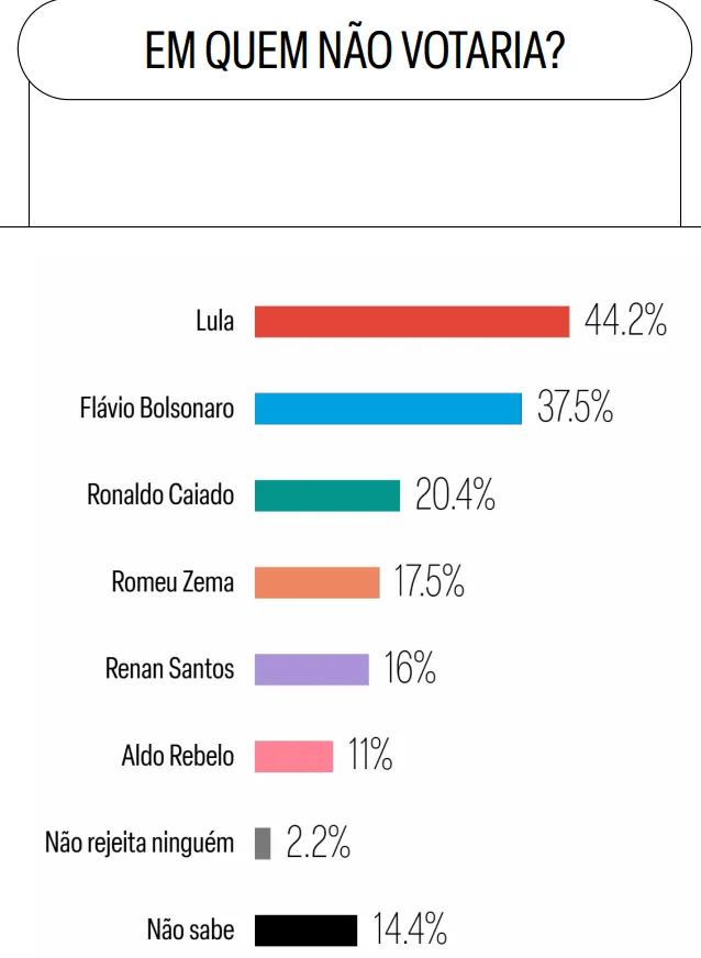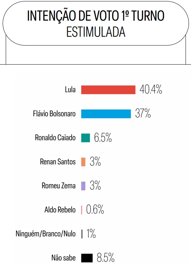 Oponentes também ficam próximos em simulação de primeiro turno. Lula alcança 40,4% e Flávio Bolsonaro atinge 37%. O terceiro índice com maior percentual é de quem respondeu não saber, com 8,5%. Depois, vêm Ronaldo Caiado (PSD), com 6,5%, Renan Santos (Missão) e Romeu Zema (Novo), ambos com 3%, e Aldo Rebelo (DC), com 0,6%. Opção ninguém/branco/nulo marcou 1%.
