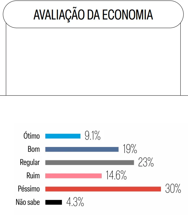 Na avaliação da economia, o maior índice é de quem responde péssimo (30%). Depois, vêm as opções regular (23%), bom (19%), ruim (14,6%), ótimo (9,1%) e não sabe (4,3%).