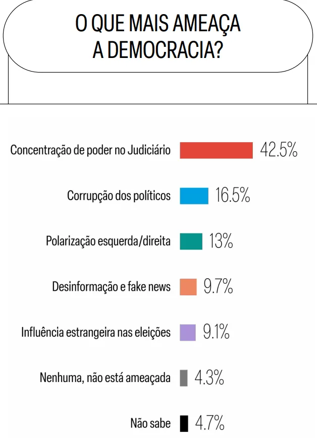 E o que mais ameaça a democracia nacional? Para 42,5%, é a “concentração de poder no Judiciário”. A opção “corrupção dos políticos” marca 16,5%, enquanto a polarização entre esquerda e direita responde por 13% das opiniões. Eleitores também puderam escolher “desinformação e fake news” (9,7%), “influência estrangeira nas eleições” (9,1%) e “nenhuma, não está ameaçada” (4,3%).