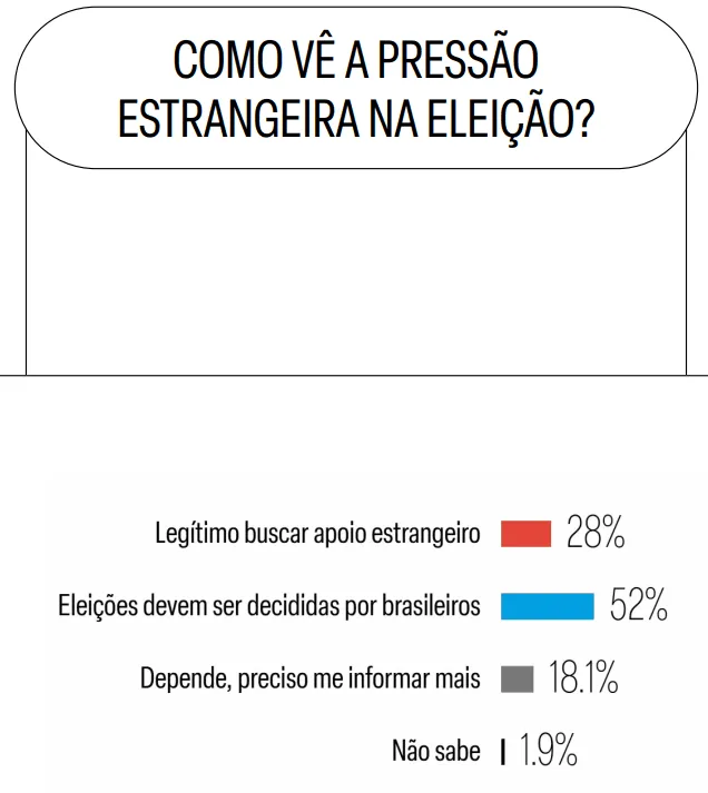 Pesquisadores também fizeram perguntas a respeito de outros temas. Sobre uma possível “pressão estrangeira” na eleição, 52% respondem que o pleito deve ser decidido por brasileiros; 28% acham “legítimo buscar apoio” de fora do país e 18,1% dizem que “depende, preciso me informar mais”.
