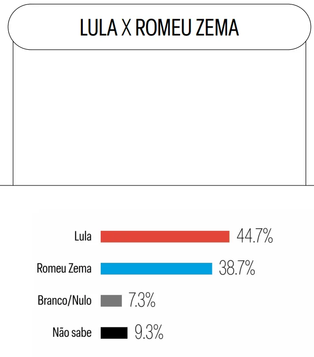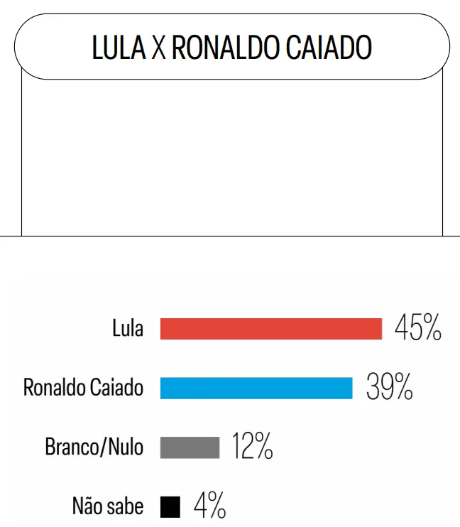 A pesquisa também projetou cenários alternativos de segundo turno. Lula vence todos os outros candidatos com vantagem acima da margem de erro. As simulações com menos folga do petista foram contra Caiado (45% a 39%) e Zema (44,7% a 38,7%).