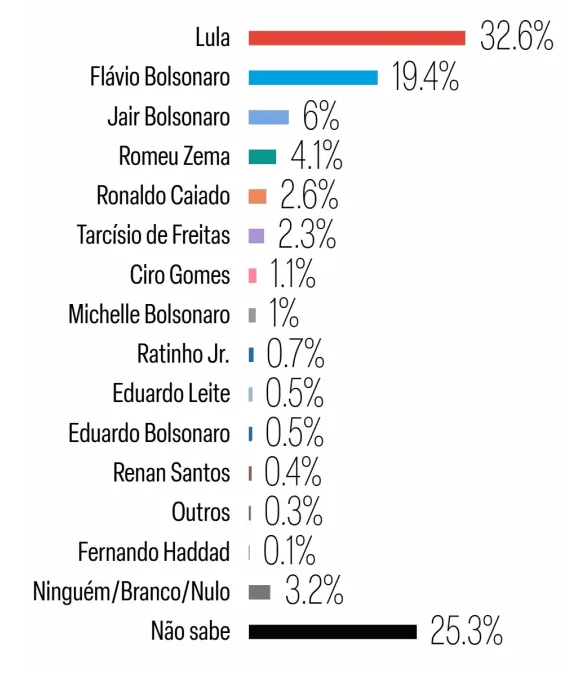 No voto espontâneo, em que entrevistadores não dizem nomes de candidatos a eleitores, Lula lidera com 32,6%, seguido de Flávio Bolsonaro (19,4%). O terceiro colocado é Jair Bolsonaro (6%), que segue inelegível e em prisão domiciliar após condenação por tentativa de golpe de Estado. Completam o top 5 Zema (4,1%) e Caiado (2,6%).