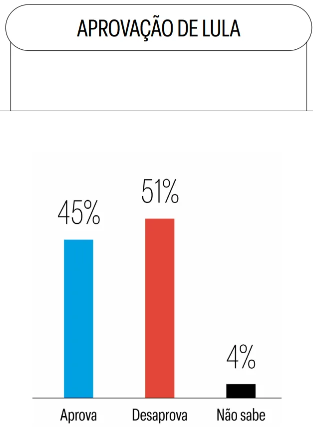 Em relação ao trabalho de Lula, 51% afirmam desaprovar o petista, enquanto 45% respondem aprová-lo; 4% não sabem responder.