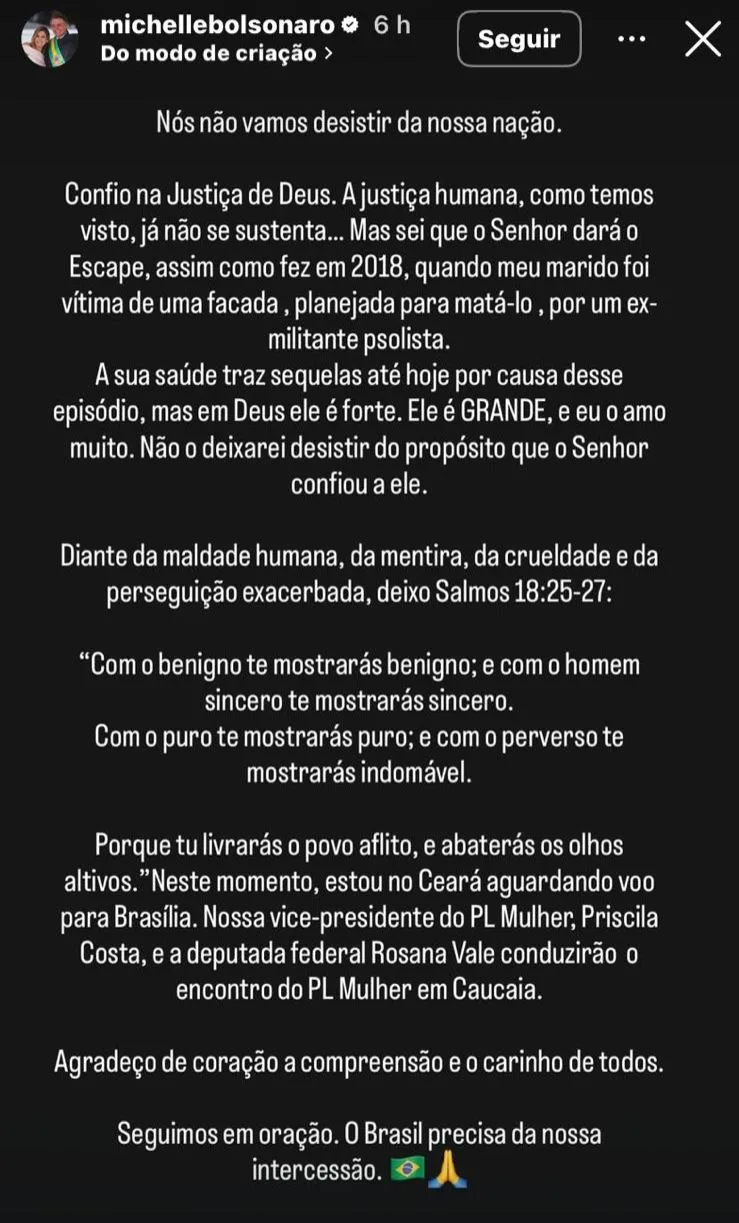 A ex-primeira-dama também compartilhou um trecho do Salmo 18 da Bíblia, mencionando “maldade humana”, “mentira” e “perseguição exacerbada”. Segundo ela, no momento da publicação, estava no Ceará, de onde seguiria para Brasília. Michelle explicou que não participaria do encontro do PL Mulher em Caucaia e que o evento seria conduzido pela vice-presidente nacional do núcleo, Priscila Costa, e pela deputada federal Rosana Vale.
