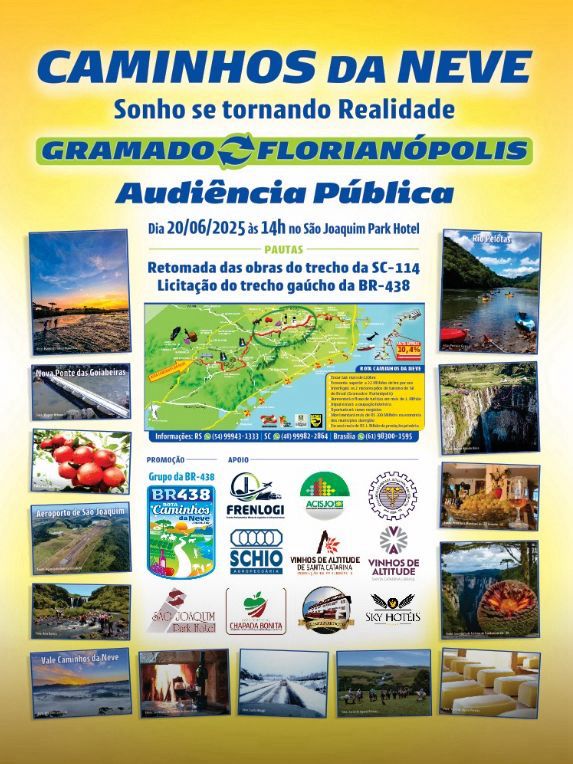 Uma importante Audiência Pública acontece nesta sexta-feira (20) às 14h, no São Joaquim Park Hotel, para debater a integração das rodovias SC-114 e BR-438, que compõem a tão aguardada Rota Caminhos da Neve. A pavimentação desta rodovia é uma demanda histórica de mais de 59 anos, e a expectativa é que sua conclusão impulsione o desenvolvimento integrado de cinco regiões turísticas estratégicas: Serra Gaúcha, Região das Hortênsias, Campos de Cima da Serra, Serra Catarinense e Vale do Araranguá.