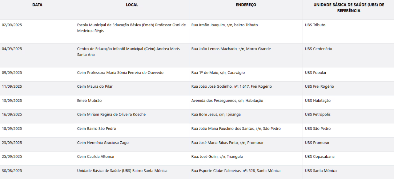 O serviço estará disponível às terças e quintas-feiras, no período da tarde, das 14h às 18h. A agenda foi planejada para que o carro fique estacionado em frente a Centros de Educação Infantil (Ceims), Escolas Municipais (Emebs) e Unidades Básicas de Saúde (UBSs), facilitando o acesso da comunidade. A iniciativa é uma parceria com a Secretaria de Educação e tem como foco principal a vacinação do público infantil.