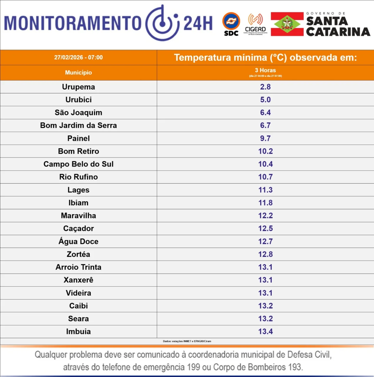 O amanhecer desta sexta-feira (27) trouxe temperaturas típicas de inverno para os municípios da Serra Catarinense. De acordo com dados do monitoramento da Defesa Civil de Santa Catarina, as menores temperaturas foram registradas entre as 04h e as 07h da manhã.