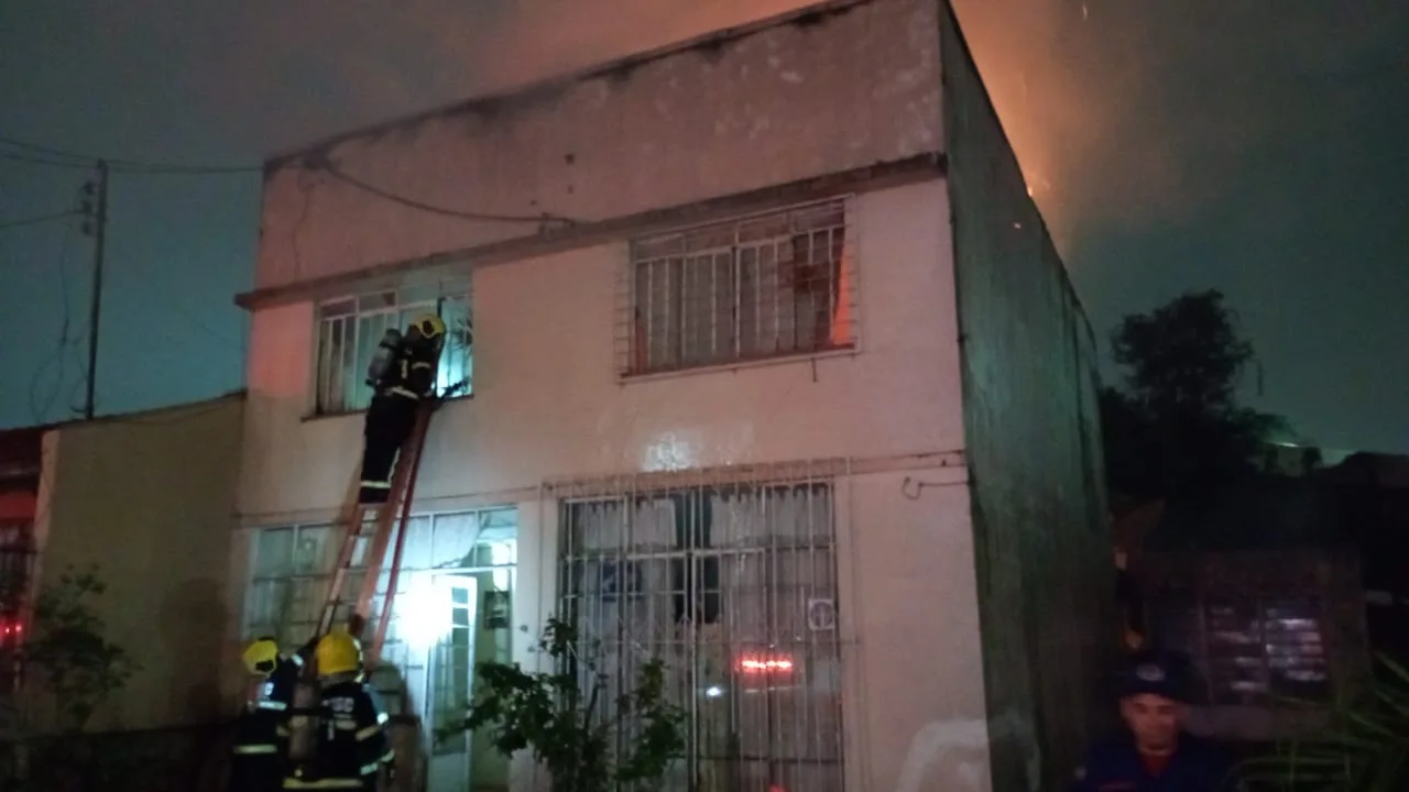 As equipes de socorro confirmaram o incêndio em uma casa de dois andares. O foco principal das chamas estava concentrado na parte dos fundos do segundo pavimento.