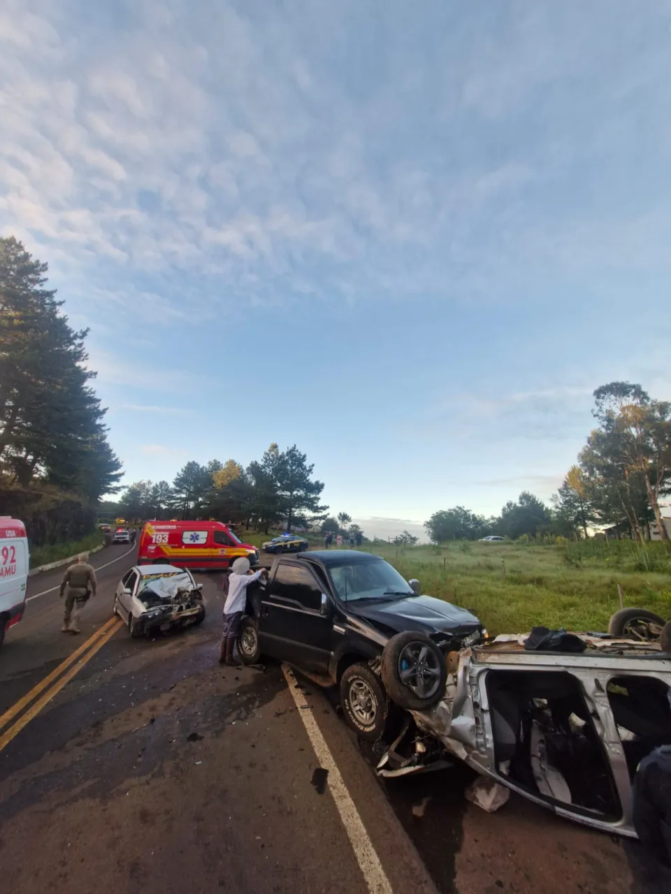 Durante o atendimento, foram encontradas três pessoas encarceradas dentro de uma Ford F-250, com placas de Videira (SC). As equipes dos bombeiros realizaram a estabilização dos veículos e o acesso às vítimas por meios não destrutivos. Em seguida, foi necessário o uso de técnicas destrutivas, com a retirada das portas e encostos dos bancos, para possibilitar a extração segura dos ocupantes, com o apoio das equipes de atendimento pré-hospitalar.