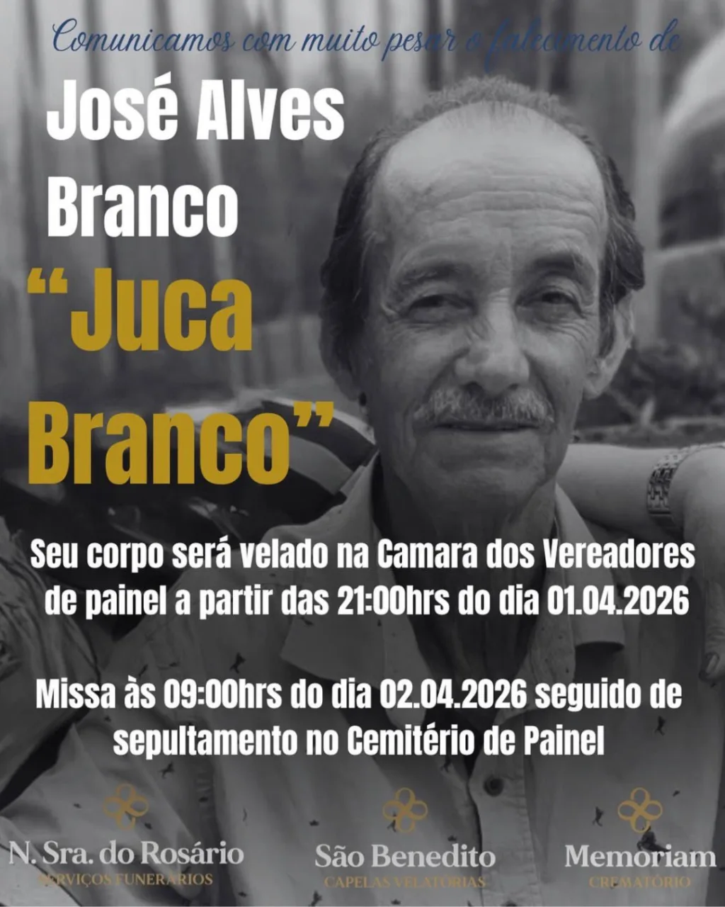 O corpo de José Alves Branco será velado na Câmara de Vereadores de Painel a partir das 21h desta quarta-feira (1º). A missa de corpo presente está programada para as 9h de quinta-feira (2), seguida pelo sepultamento no Cemitério Municipal de Painel.