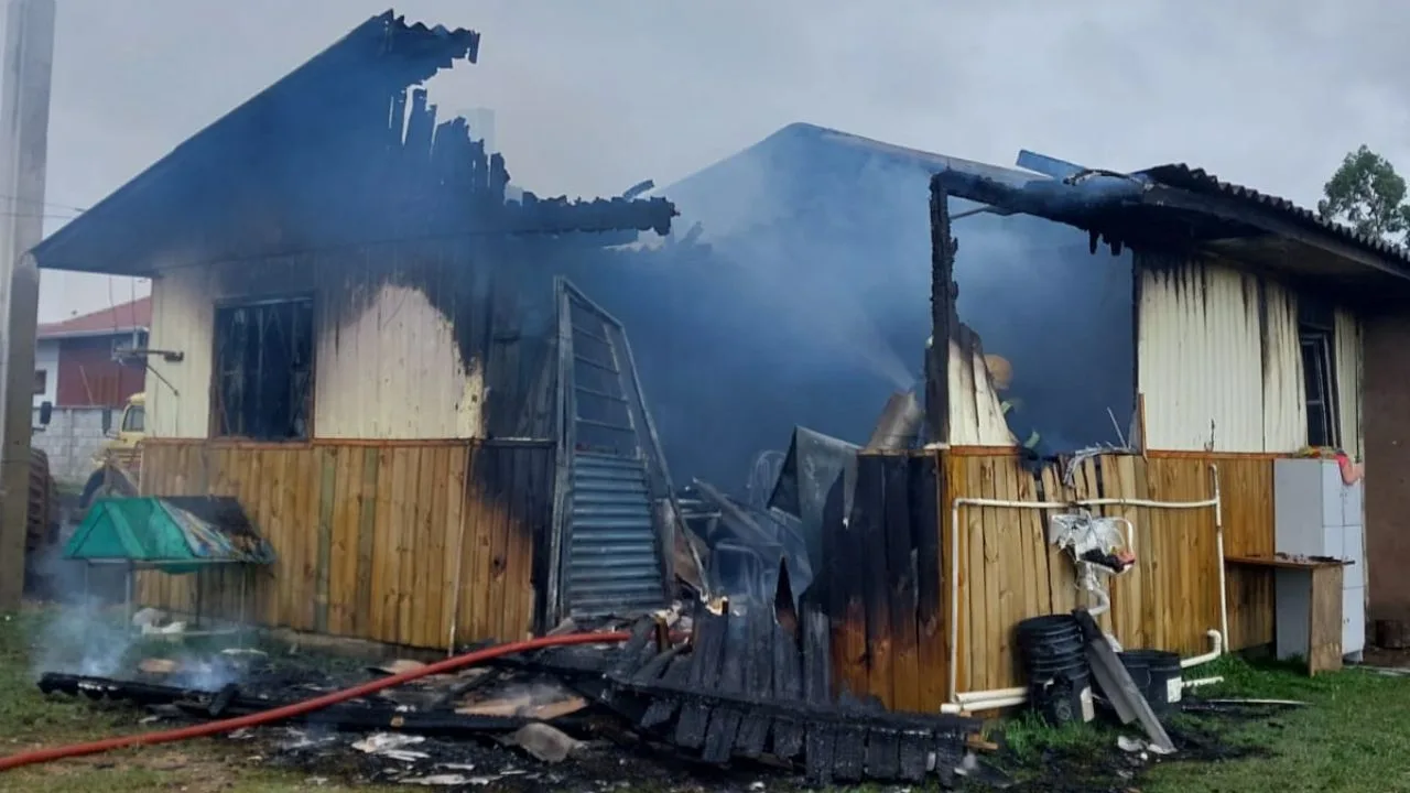 Uma residência de madeira de aproximadamente 50 metros quadrados foi atingida por um incêndio na manhã desta terça-feira (14), na Rua Esporte Clube Cruzeiro, bairro Santa Mônica, em Lages. O Corpo de Bombeiros Militar de Lages foi acionado por volta das 09h16 para conter o fogo que consumiu quase toda a estrutura.