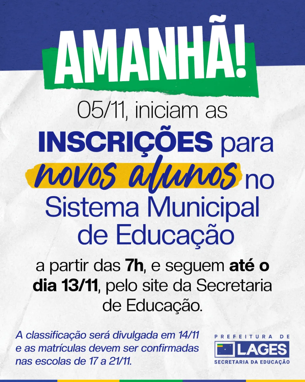 As inscrições poderão ser realizadas a partir das 7h00min e seguem até o dia 13 de novembro, devendo ser efetuadas exclusivamente pelo site da Secretaria Municipal de Educação.