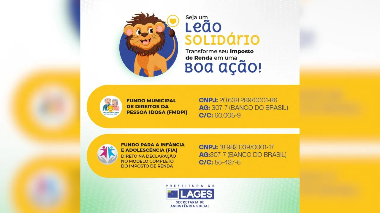 Com a proximidade do período de declaração do Imposto de Renda 2026, a Prefeitura de Lages, por meio da Secretaria de Assistência Social, iniciou uma campanha de conscientização para a destinação solidária de tributos. A iniciativa permite que pessoas físicas mantenham parte do recurso no município para financiar projetos sociais locais.