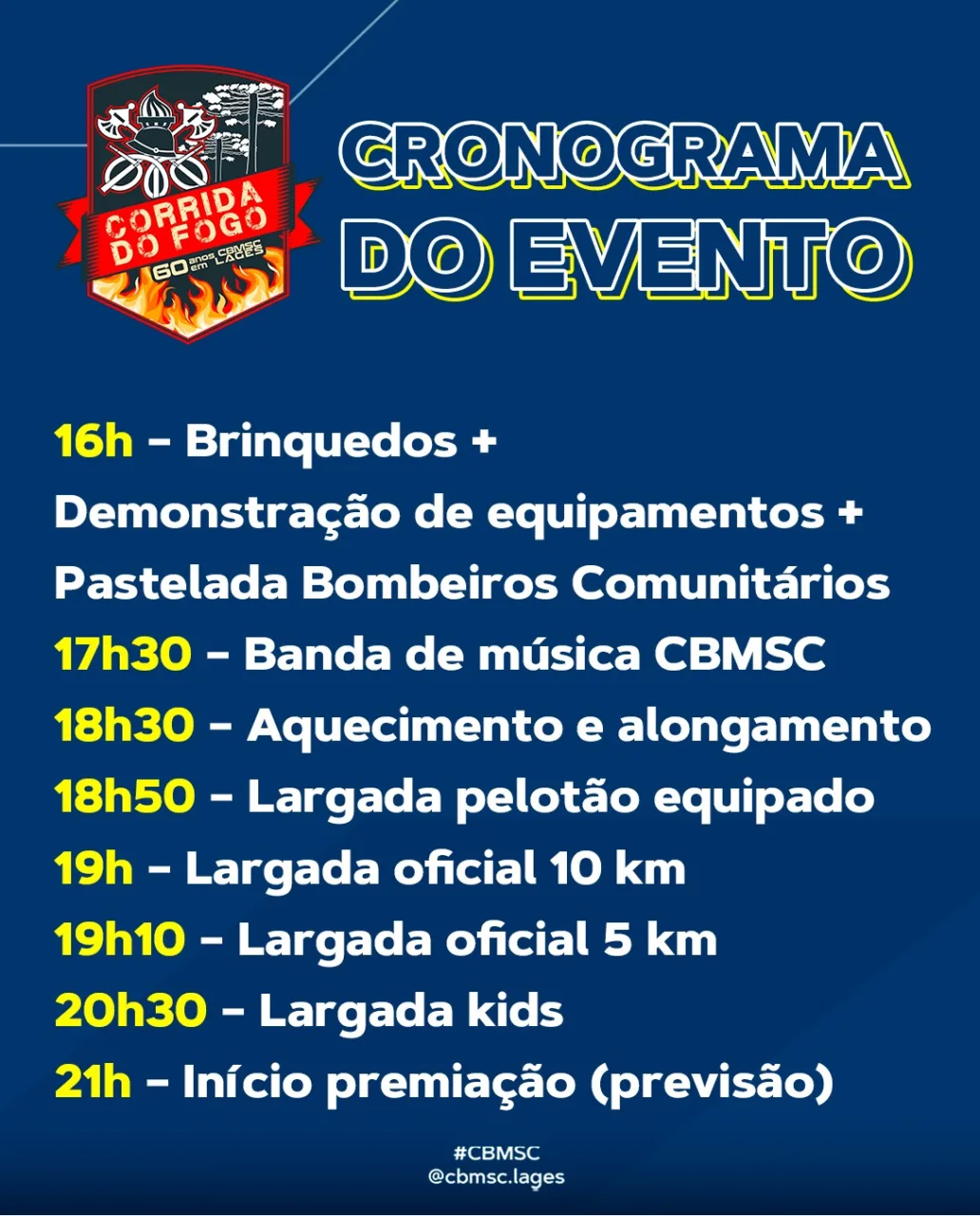 Lages sediará, pela primeira vez, neste sábado (4), a Corrida do Fogo 2025, evento que integra as celebrações dos 60 anos do Corpo de Bombeiros Militar de Santa Catarina (CBMSC) na cidade. A programação terá início à tarde, com diversas atividades concentradas no Quartel do Corpo de Bombeiros, localizado na Rua Mato Grosso, 171, no bairro São Cristóvão.