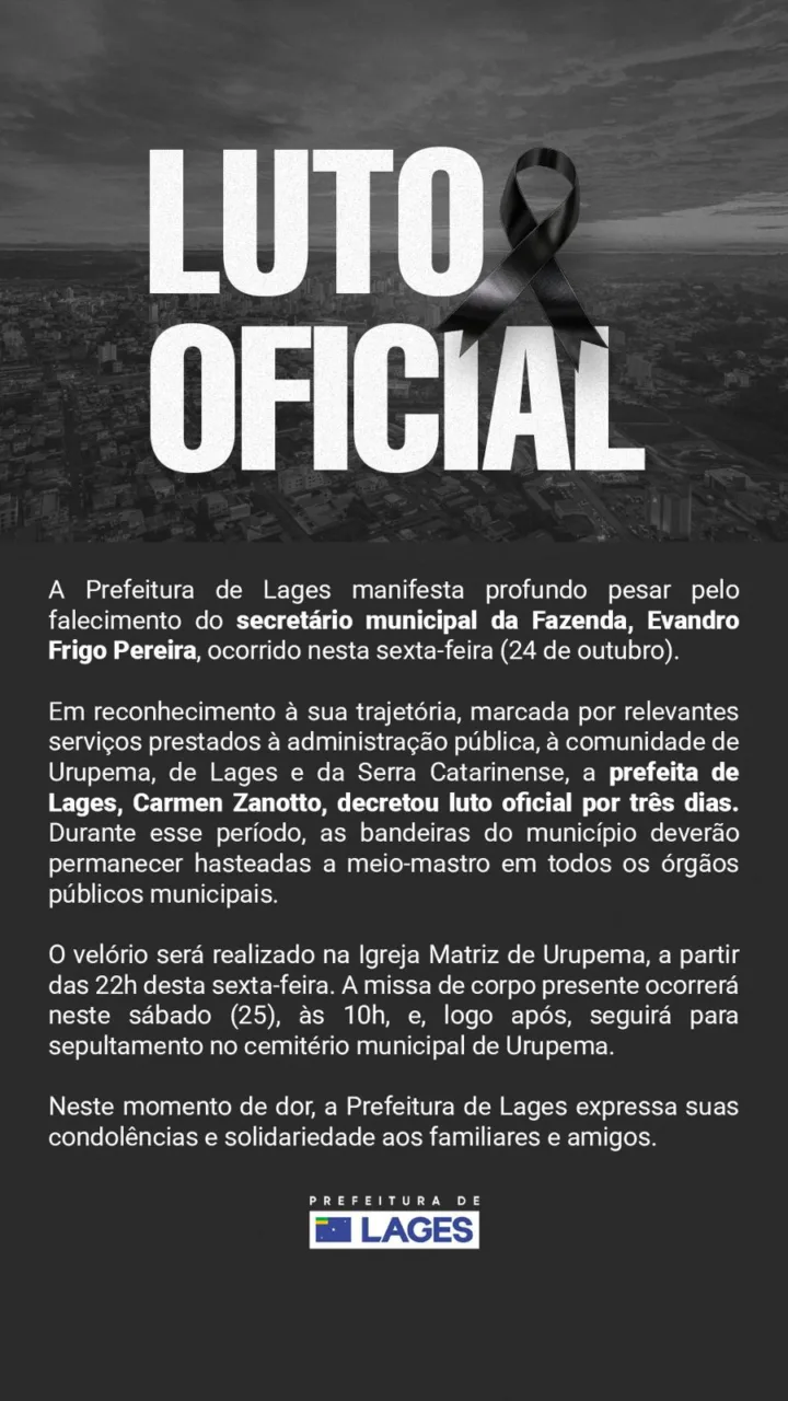 “A Prefeitura de Lages manifesta profundo pesar pelo falecimento do secretário municipal da Fazenda, Evandro Frigo Pereira, ocorrido nesta sexta-feira (24 de outubro).
